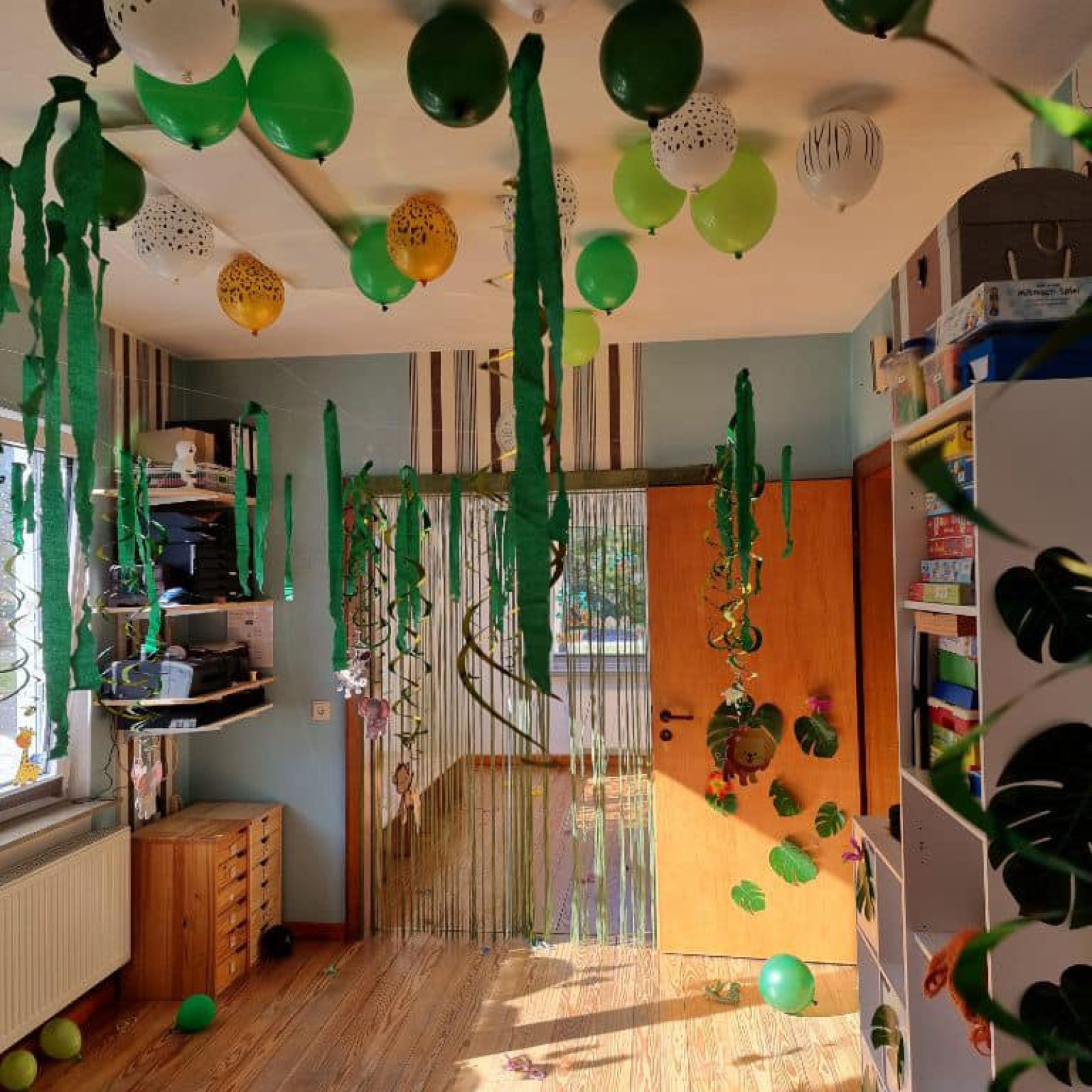 Erst letzte Woche haben wir neben der hängenden Dschungeldeko unsere neue Fensterdeko abgeschlossen. Die grünen Faden-Vorhänge in den Türen sind bei den Kindern besonders beliebt. Nach anfänglicher Scheu hindurchzugehen , sind sie nun bei allen ein Highlight. Da wird durchgegangen und gefühlt, was das Zeug hält.