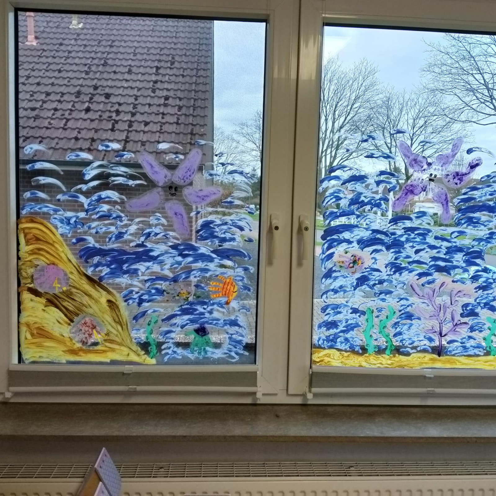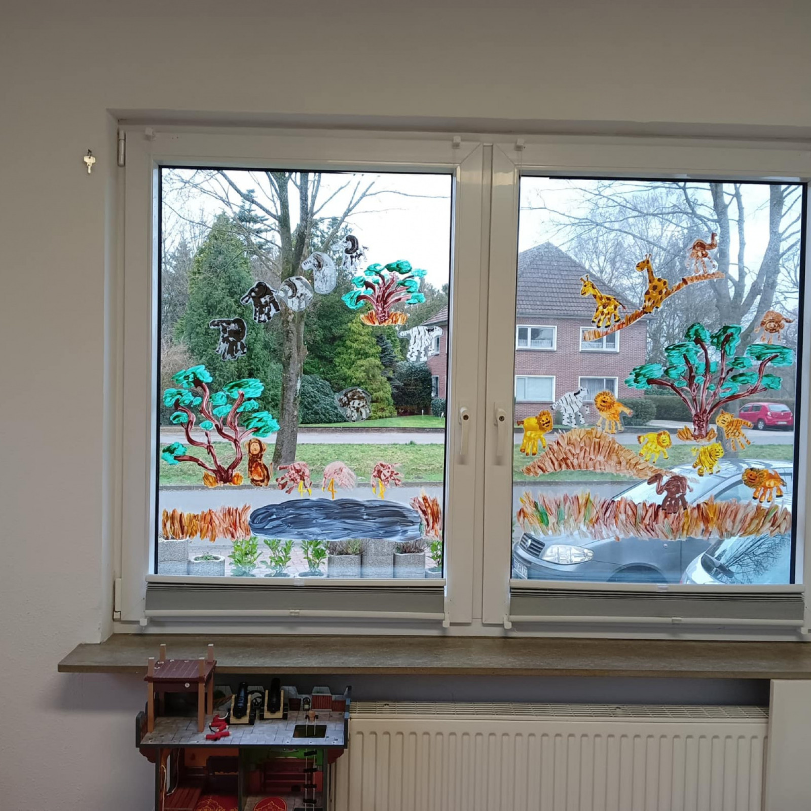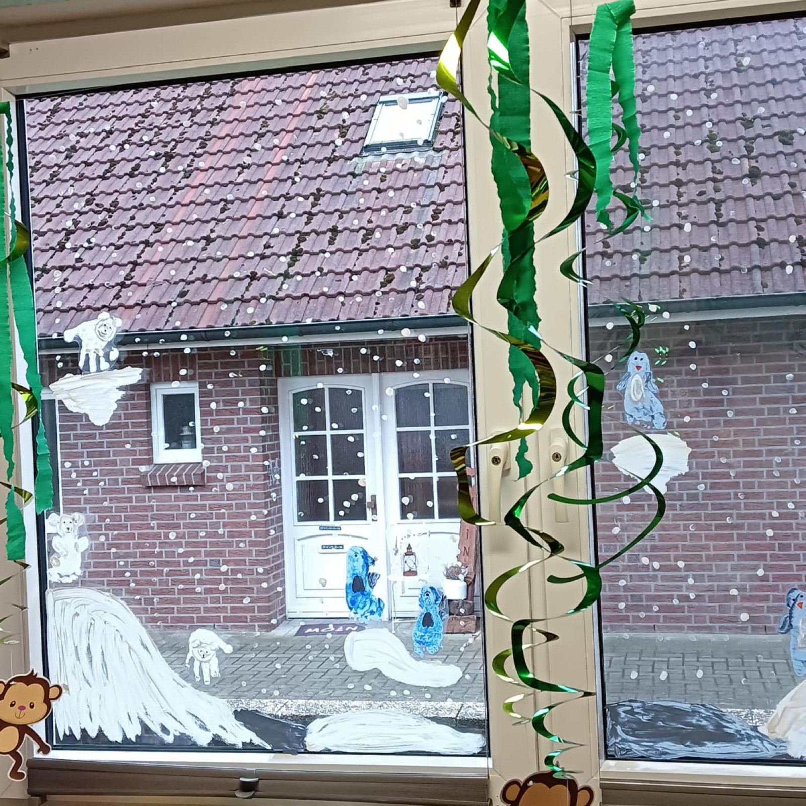 Unsere drei Fenster wurden passend zu den drei Zoowelten ( Wüste/ Land, Wasser und Eis) bemalt und schließlich mit Tieren dekoriert. Das besondere an den vielen kleinen Tierchen ist, dass sie mit viel Liebe von unseren kleinen De Fehntjer Wichteln gemacht wurden . Jedes Tier trägt die Form eines Fußes oder einer Hand. Für die Kinder ein riesen Spaß..., schließlich ist so ein Pinsel an der Hand oder aber am Fuß was ganz schön kitzeliges.